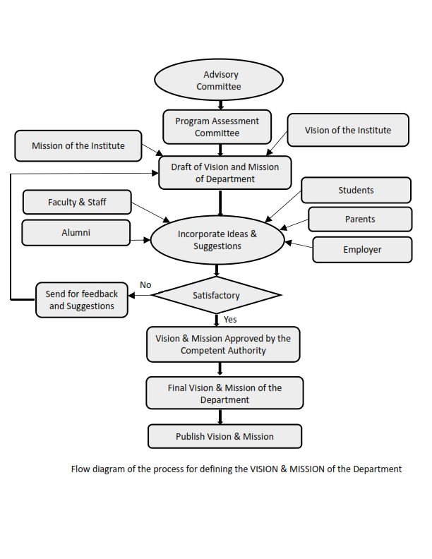 Step 1. The advisory Committee of the Institute decided to modify the various departmental Vision and Mission statements and asked the HODs to take up this matter in their departments respectively. The committee also decides to modify the institute Vision and Mission statement. Step 2. HODs took up the matter with Program Assessment Committee of their respective departments. Step 3. The Program Assessment Committee provided the basic draft of the department Vision & Mission in alignment with Graduate Attributes along with the Vision & Mission of the institute. Step 4. Draft of Vision & Mission was discussed with the faculty in the departmental meeting. Step 5. Faculty members were requested to discuss the Vision & Mission statements in their respective classes and ask the students to give their inputs. Vision & Mission statement drafts were displayed on the notice board. Step 6. Suggestion of Alumni regarding Vision and Mission statement given in their feedback forms were incorporated. Step 7. Further suggestions were invited from parents & prospective employers. Step 8. The assessment committee reviewed the suggestions & framed the final Statements. Step 9. HOD of the Department approached the Director/Director General for His/Her final Views and Approval. Step 10. Vision & Mission statements of the department were finalized. Step 11. The Vision & Mission statement were published and displayed. |